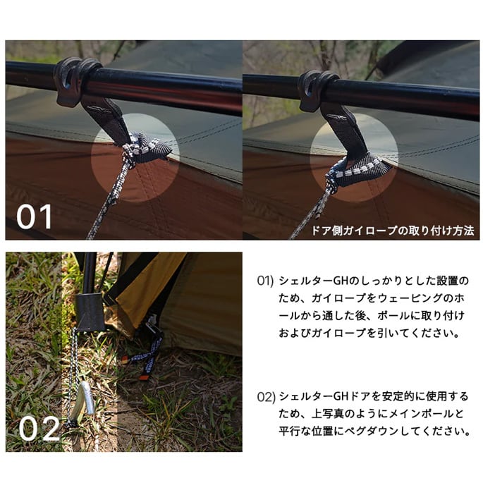 メイン素材にT/C素材を採用し結露を最小限に、構造は利便性の高いSHELTER Gの特性を生かしています。またオプションであるメッシュドアとTPUドアは、簡単に脱着できる為、 使用者の用途と環境に合わせて自由な応用が効きます。
